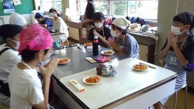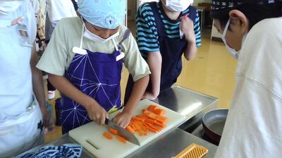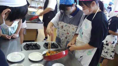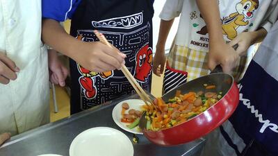 にんじんを短冊切りにしたり、小松菜を食べやすい大きさに切ったりするところが難しかったようですが、一生懸命作りました。どの班も、とてもおいしい野菜炒めができました。