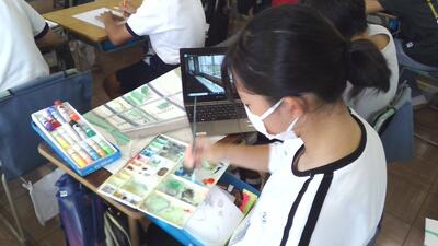 図工の学習で「私の大切な風景」として学校の絵を描いています。タブレットで写真を撮影し、近いもの、遠いもので大きさを分けて描くことを学びました。だんだん立体的な作品ができてきました。6年間過ごした学校を自分なりに試行錯誤しながら絵に表す姿がとても印象的でした。