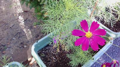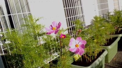 今週、2つのグループの鉢から、鮮やかな赤とピンクのコスモスが咲きました。