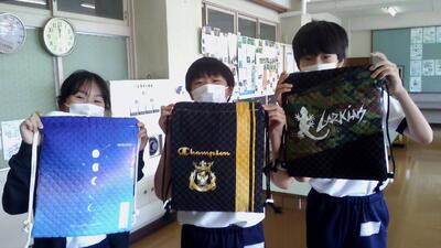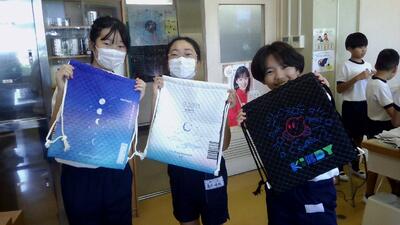 家庭科のナップザックが完成しました。記念に写真をとりました。