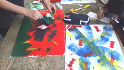 図工でローラーを使った表現を学習しました。ローラーと材料の組み合わせ方や色の使い方やローラーの転がし方など様々な工夫を使って自分のイメージを広げながら作品を完成させました。