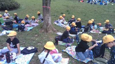 広い公園でみんなで食べるお弁当はおいしくて、とても気持ちがよいです。