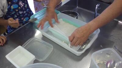 温めた豆乳に「にがり」を入れていきます。「子どもたちが真剣な表情でにがりを入れると、白い豆乳がみるみるうちに固まり始め、やわらかなお豆腐に変わっていく様子に「わあ!」「すごい!」と歓声が上がりました。