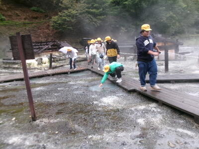 足湯では日光の源泉をしようした足湯に浸かり、ポカポカした気持ちで楽しみ、源泉散歩で温泉が湧きだしているところに手を入れてみたり、独特の匂いを嗅いでみたりと新たな発見がたくさんありました。