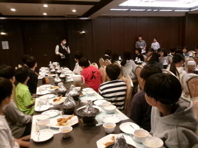 食事会場につくと、豪華なホテルの食事が机に用意されているのを見て、「わぁ~!」と目を輝かせている子どもたちでした。スープとご飯はおかわりはできると聞き、いつも以上にモリモリ食べていました。